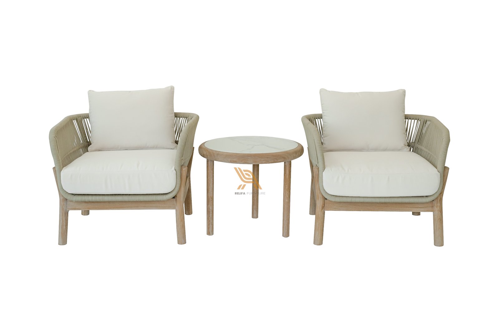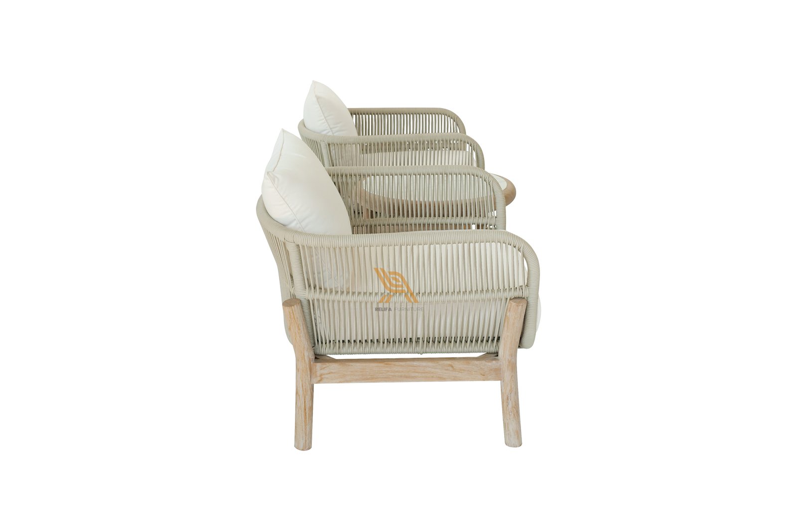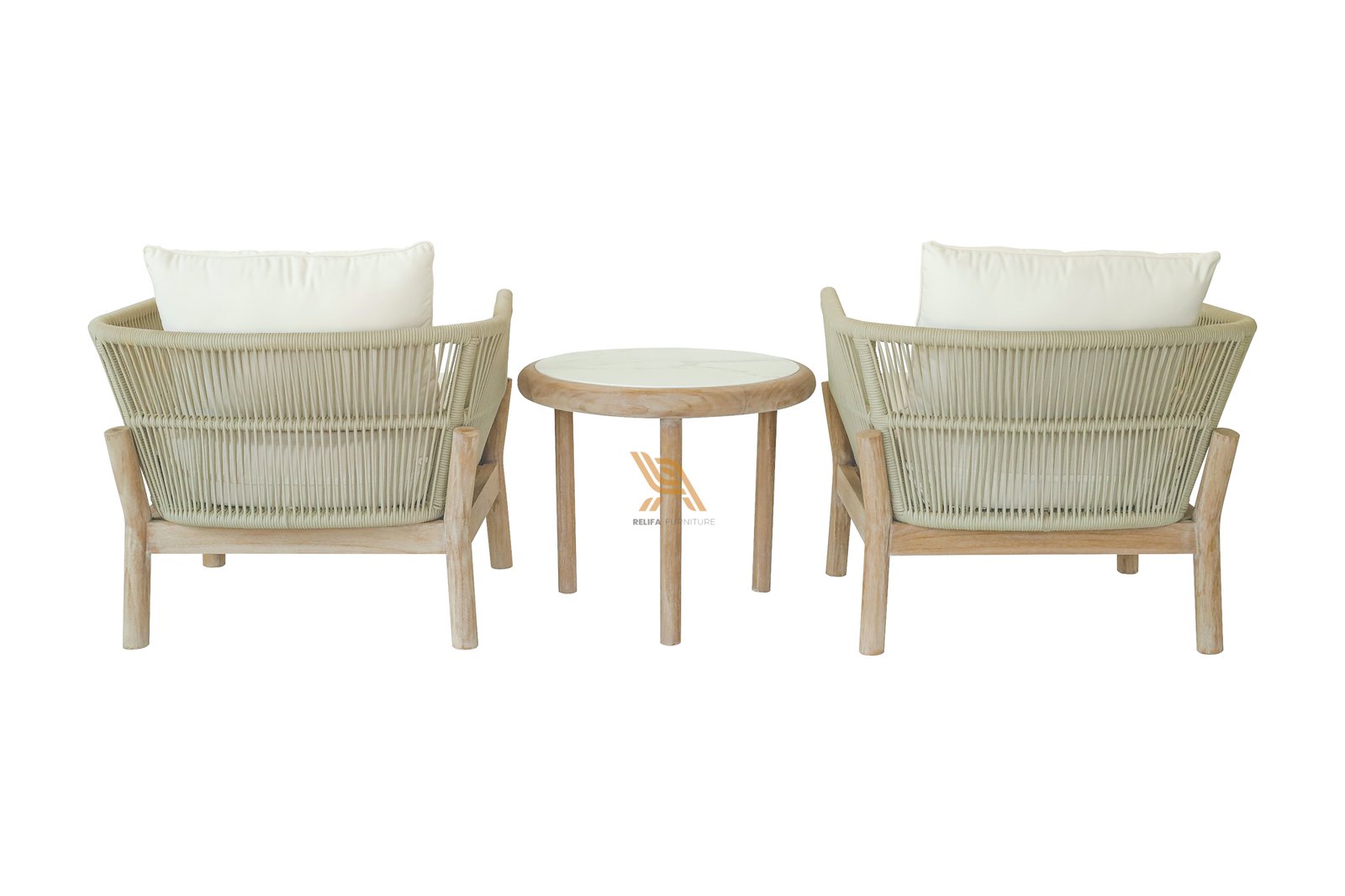 This 3-Piece Modern Roped Teak Wood Conversation Set is designed to elevate any patio, garden, balcony, or outdoor lounge area with comfort and contemporary style. The set includes two armchairs crafted with a durable teak wood frame, finished in a light natural tone for a warm and inviting appearance.