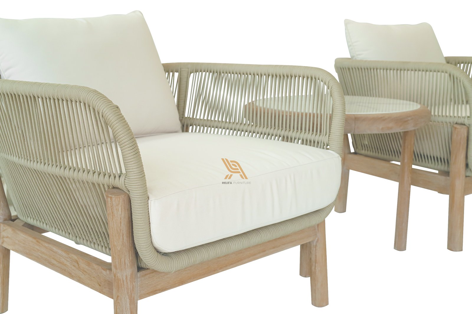 Each chair features handwoven rope detailing that enhances airflow and adds a luxurious textured look. Paired with soft beige cushions, the set provides exceptional comfort for relaxing, reading, or social gatherings.