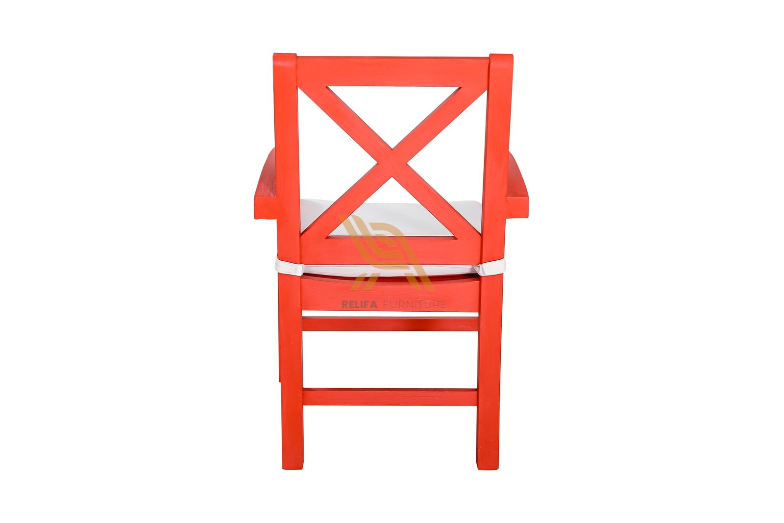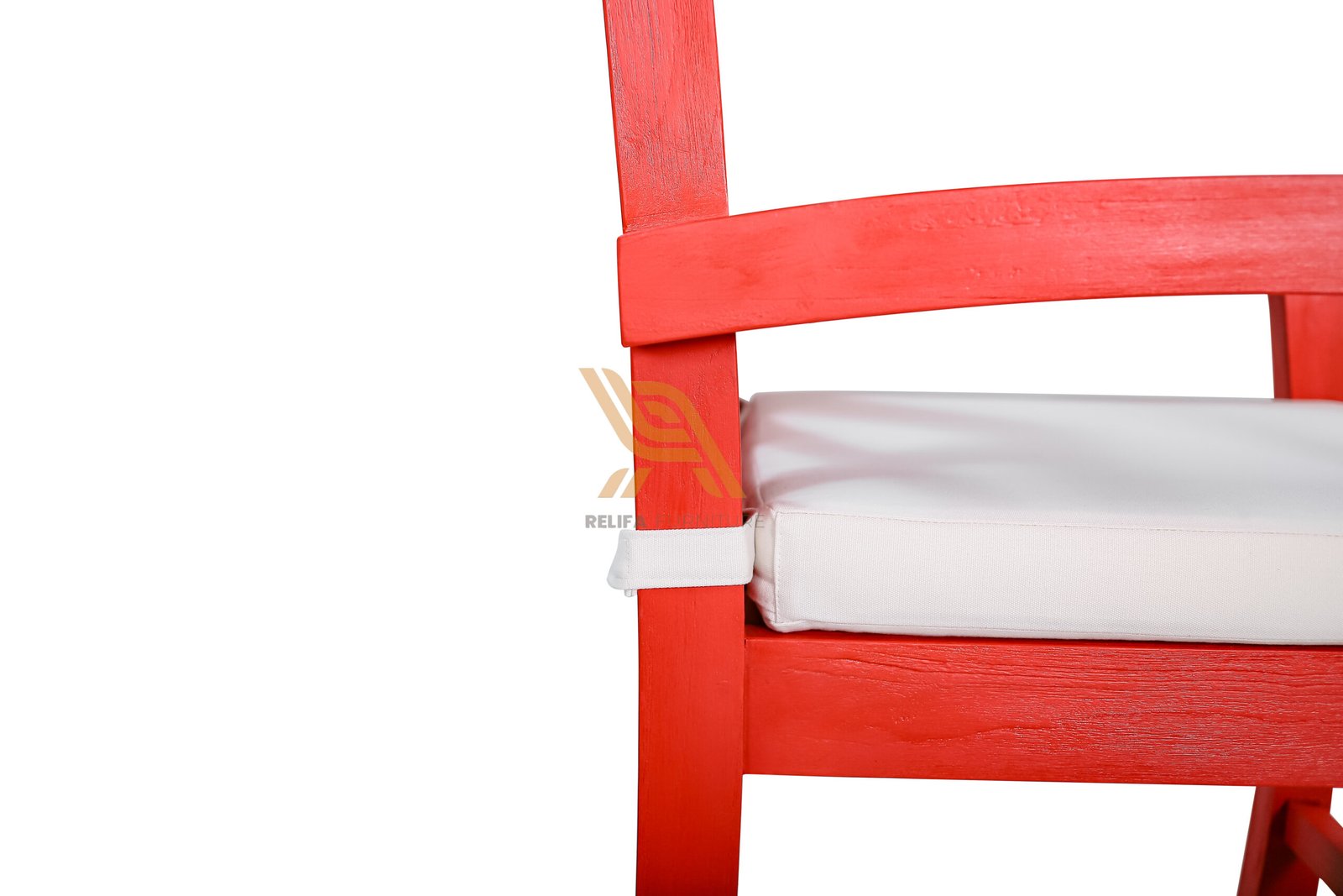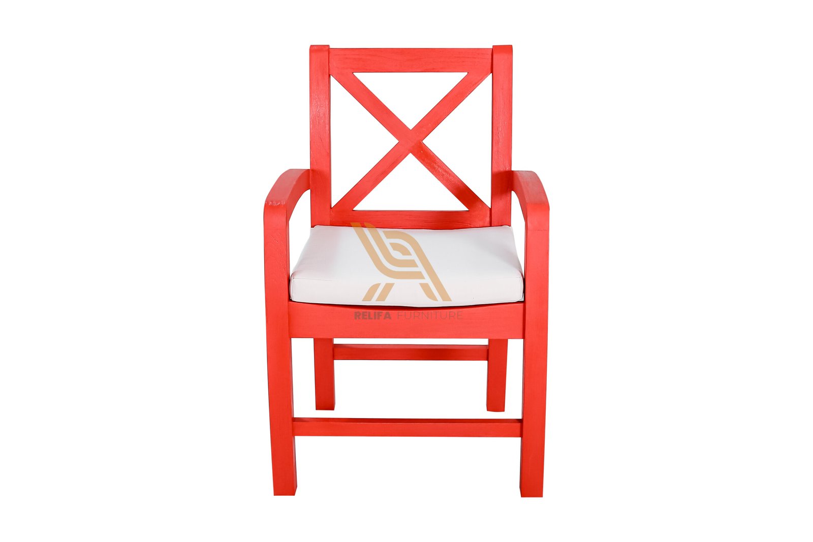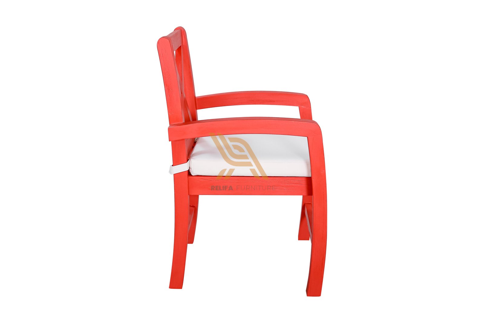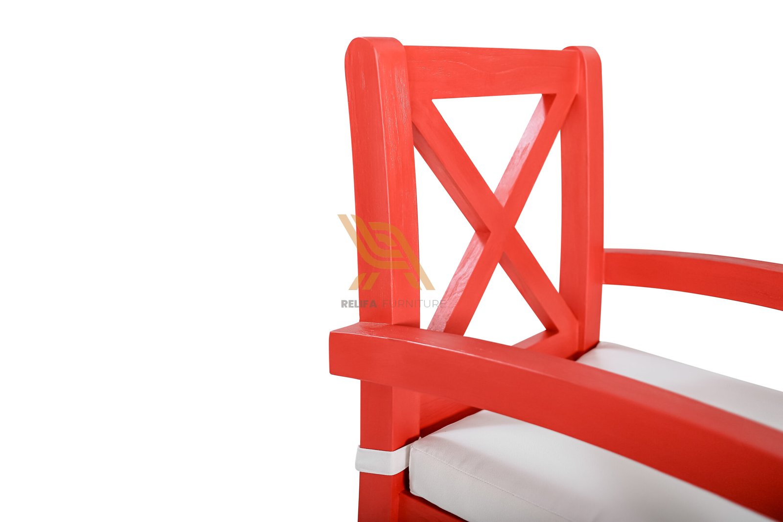 This Patio Dining Chair with Arms & Brown Leather Pad – Red Finish adds a bold, stylish touch to any outdoor setting. Featuring a solid wooden frame with a smooth red finish, the chair stands out with its vibrant character while maintaining a natural, warm aesthetic.